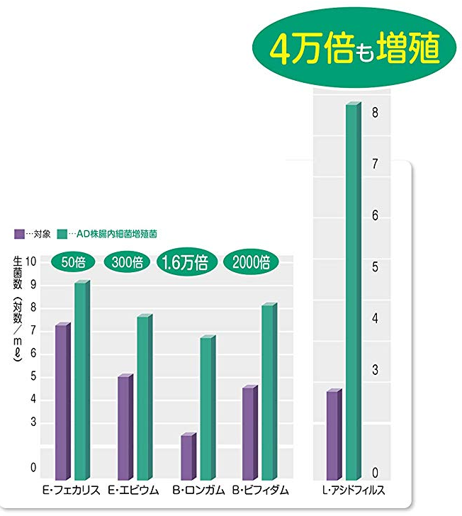 - AD株の腸内細菌増殖作用でなんと最大4万倍まで増殖します!